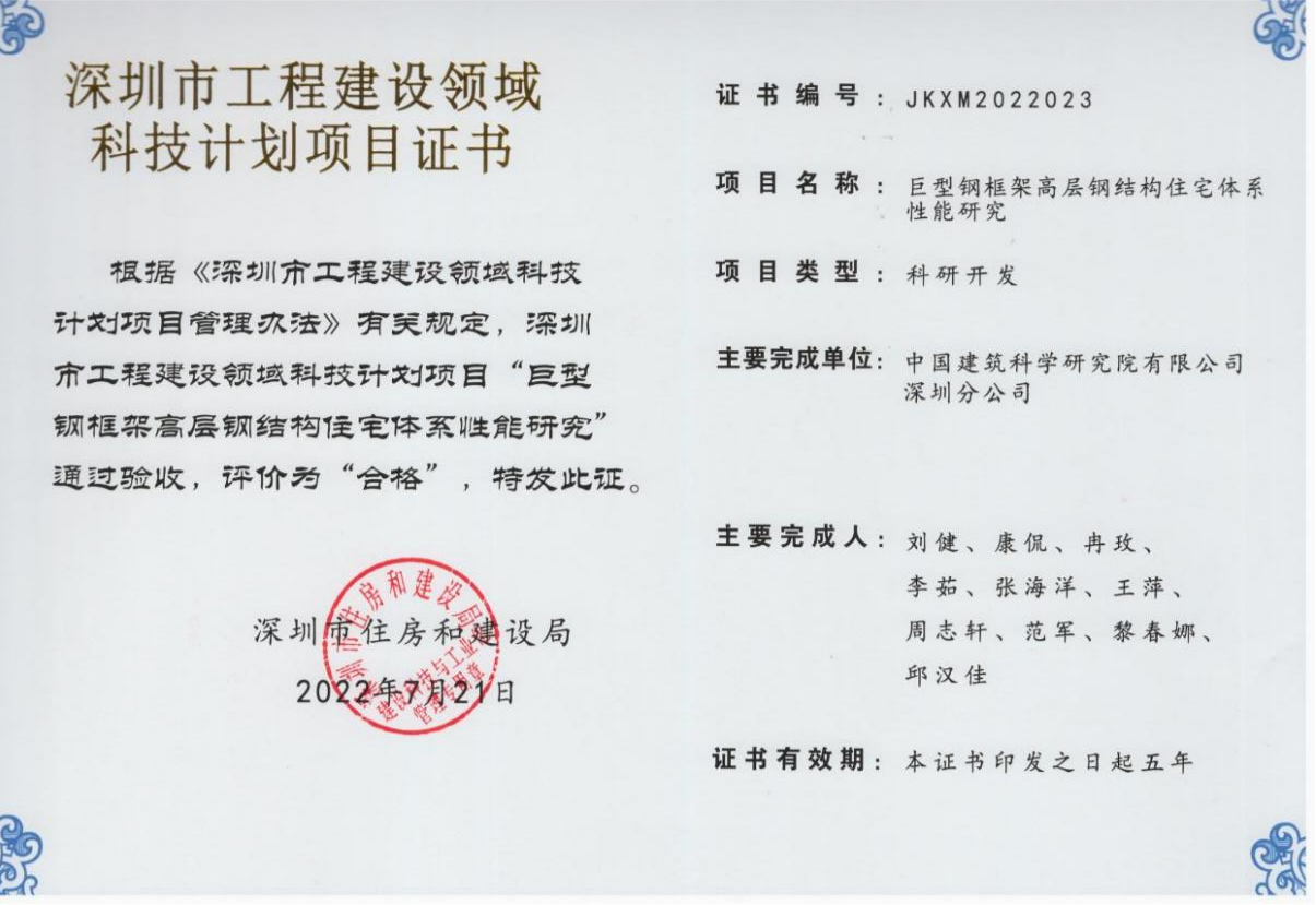 該項目是深圳市工程建設領域科技計劃項目,巨型鋼框架高層鋼結構住宅結構體系,是根據已有的巨型鋼框架結構體系的特點和多層裝配式住宅的成熟經驗,將巨型鋼框架作為主結構、主框架間的多層結構作為次結構,將二者有機結合,從而形成的一種新型高層鋼結構住宅結構體系。