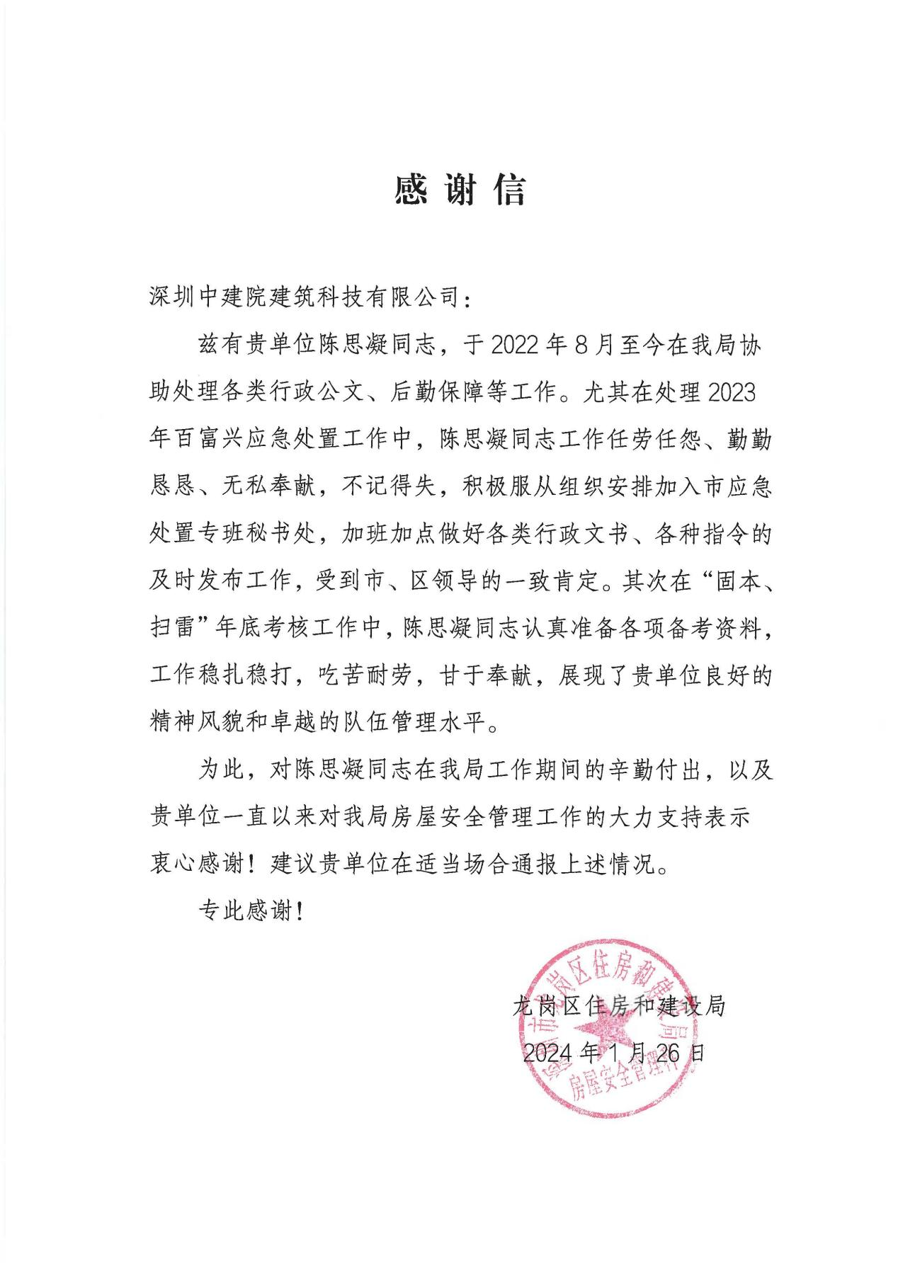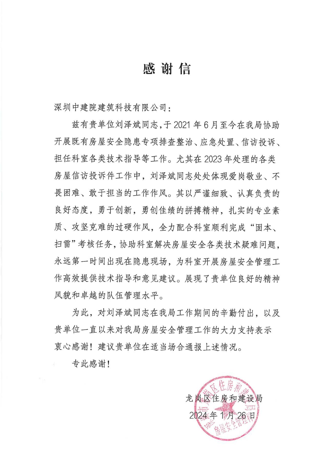 近期,深圳中建院建筑科技有限公司(以下簡稱“深圳中建院”)收到深圳市龍崗區(qū)住房和建設(shè)局發(fā)來的感謝信,對深圳中建院多年來在房屋安全管理工作中的大力支持表示感謝,對劉澤斌、陳思凝兩位同志的辛勤付出提出表揚。