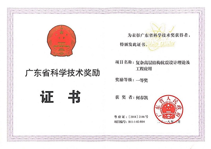 2018年 3月11日,廣東省人民政府發布了關于2017年度廣東省科學技術獎的通報。根據《廣東省科學技術獎勵辦法》,經省科學技術獎評審委員會評審、省科技廳審核、省人民政府批準授予,深圳中建院建筑科技有限公司(下稱深圳中建院)、中建院總經理何春凱榮獲2017年度廣東省科學技術獎一等獎。獲獎項目《復雜高層結構抗震設計理論及工程應用》,是深圳中建院建筑科技有限公司和哈爾濱工業大學合作完成的課題。