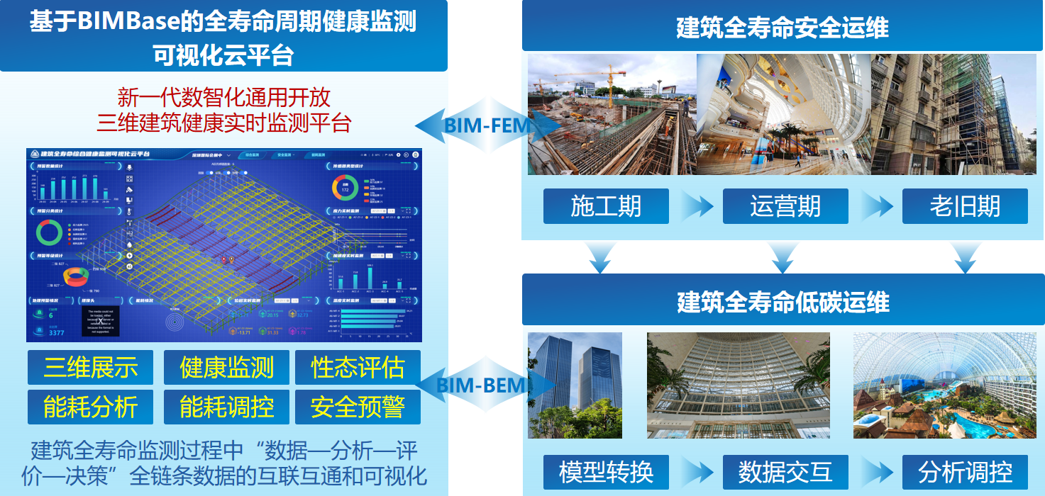 ??“建筑安全與能耗數(shù)字化集成監(jiān)測(cè)關(guān)鍵技術(shù)”科技成果針對(duì)現(xiàn)階段建筑安全及能耗整體綜合性能狀態(tài)的分析、理解、預(yù)警難度大,結(jié)構(gòu)安全與建筑能耗運(yùn)維效率低下,海量建筑數(shù)字信息安全可控能力差的突出問(wèn)題,面向我國(guó)“數(shù)字住建”建設(shè)發(fā)展目標(biāo),積極響應(yīng)數(shù)字化轉(zhuǎn)型背景下建筑全壽命周期內(nèi)健康與綠色運(yùn)維的重大需求,搭建了基于國(guó)產(chǎn)自主知識(shí)產(chǎn)權(quán)BIMBase的建筑全壽命周期健康監(jiān)測(cè)可視化云平臺(tái),提出了建筑圍護(hù)結(jié)構(gòu)與主體結(jié)構(gòu)關(guān)聯(lián)性分析與一體化監(jiān)測(cè)技術(shù),開(kāi)發(fā)了建筑在實(shí)際運(yùn)行邊界條件下的最優(yōu)能效仿真平臺(tái),研制了基于BIMBase平臺(tái)的建筑信息模型到建筑能耗模型的高效轉(zhuǎn)換工具,形成了建筑安全與能耗數(shù)字化集成監(jiān)測(cè)成套關(guān)鍵技術(shù)體系,增強(qiáng)了專業(yè)領(lǐng)域核心競(jìng)爭(zhēng)力。