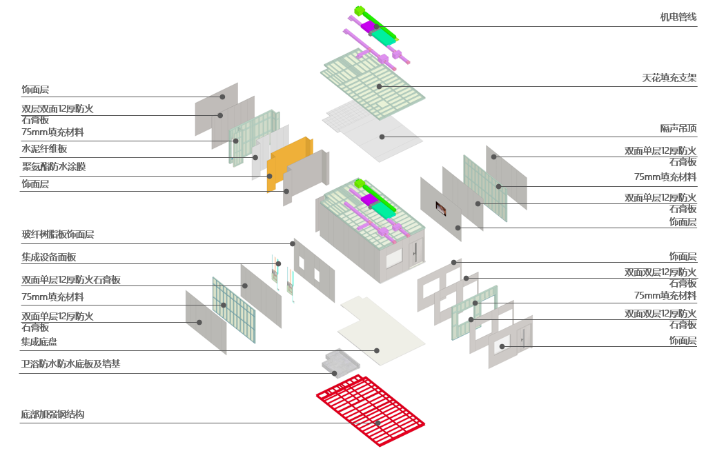 ?深圳市人民醫院寶安醫院感染性疾病防治中心結構主體采用鋼結構,內部采用嵌入式MiC(Modular Integrated Construction)模塊化病房及MiMEP(Module-based MiMEP)裝配式機電模塊集成建造技術。項目共采用101個模塊化病房,整體裝配率達80%以上,《建筑工業化評價標準》試評價等級為AA級裝配式建筑。項目將成為國內首個永久性嵌入式MiC模塊化感染性防治病房,同時也是國內首個“模塊化負壓感染防治病房”,為“模塊化機電+模塊化建筑”的集成建造方式提供了參考示范。