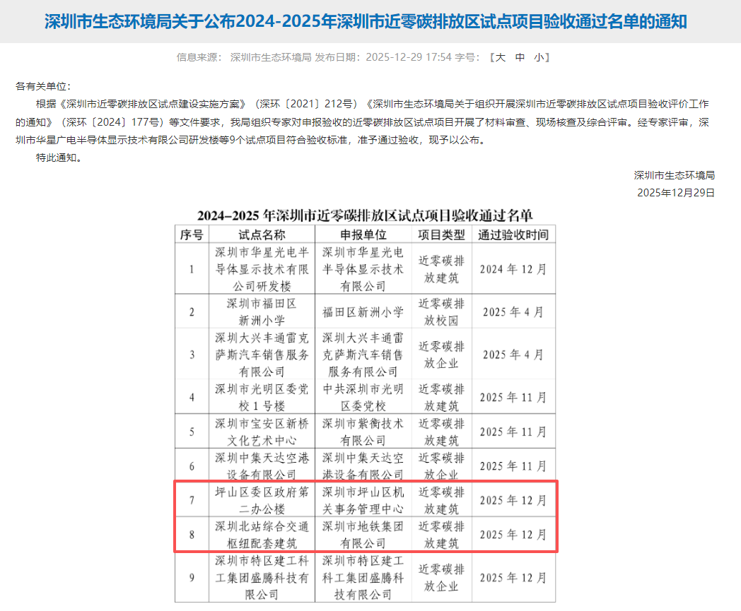 ?近日,深圳市生態(tài)環(huán)境局公布了2024-2025年深圳市近零碳排放區(qū)試點(diǎn)項(xiàng)目驗(yàn)收通過名單,由中國建研院深圳分公司提供近零碳咨詢服務(wù)的深圳北站綜合交通樞紐配套建筑、坪山區(qū)委區(qū)政府第二辦公樓項(xiàng)目均完成試點(diǎn)項(xiàng)目創(chuàng)建,達(dá)成減排目標(biāo),順利通過驗(yàn)收。