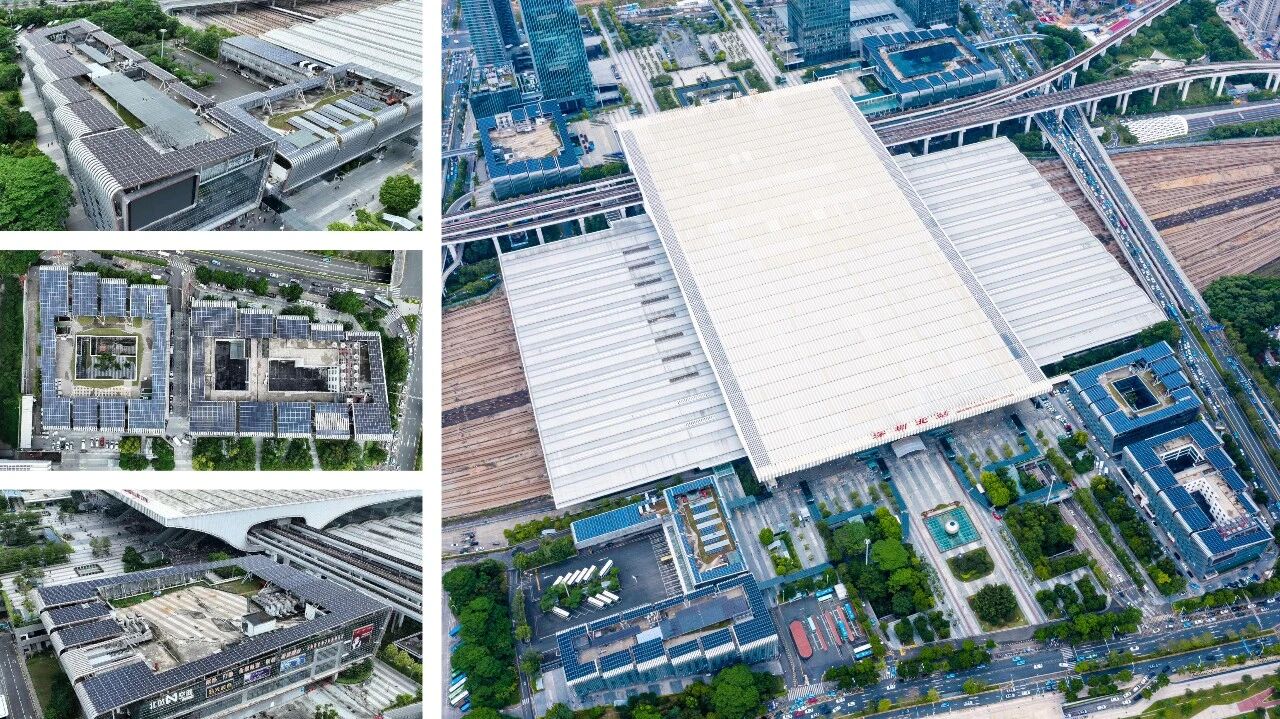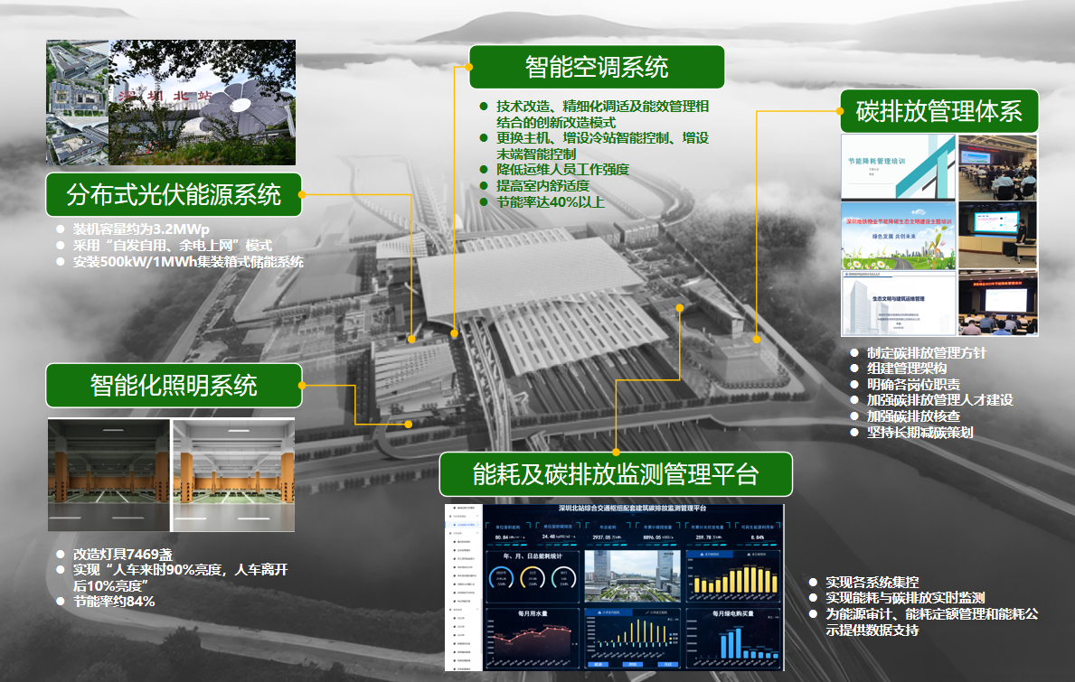 ?深圳北站綜合交通樞紐配套建筑總面積約為36萬平方米,包括東、西廣場配套建筑。改造后,項(xiàng)目降碳率達(dá)到40%以上,可再生能源利用率為8%,實(shí)現(xiàn)年節(jié)能960萬kWh,年減排二氧化碳4300噸,是深圳市近年來面積最大、減排量最大的近零碳排放試點(diǎn)建筑之一。為實(shí)現(xiàn)近零碳排放目標(biāo),在本次近零碳改造中,項(xiàng)目集成應(yīng)用了屋頂可再生能源、地下車庫智能照明系統(tǒng)、智能空調(diào)系統(tǒng)、能耗及碳排放監(jiān)測等技術(shù),并建立完善的管理機(jī)制,最大限度挖掘項(xiàng)目節(jié)能降碳潛力。建筑屋面鋪設(shè)光伏面積約1.7萬平方米,共計(jì)裝機(jī)容量3.2MWp,并配置集裝箱式儲(chǔ)能系統(tǒng);地下車庫采用高光效燈具替代原燈具,通過智能感應(yīng)控制系統(tǒng)實(shí)現(xiàn)按需照明;通過設(shè)備更新、自控升級(jí)、精細(xì)化調(diào)適相結(jié)合的改造措施對(duì)集中空調(diào)系統(tǒng)能效進(jìn)行全面提升,實(shí)現(xiàn)空調(diào)系統(tǒng)自動(dòng)化運(yùn)行,提升室內(nèi)環(huán)境舒適度,年節(jié)能率超過40%;搭建能耗及碳排放監(jiān)測管理平臺(tái),實(shí)現(xiàn)建筑能源資源消耗和碳排放的實(shí)時(shí)監(jiān)測分析、動(dòng)態(tài)管理展示,為能源審計(jì)、能耗定額管理提供數(shù)據(jù)支持;為持續(xù)保證項(xiàng)目節(jié)能減排效果,構(gòu)建全生命周期低碳運(yùn)營管理體系。