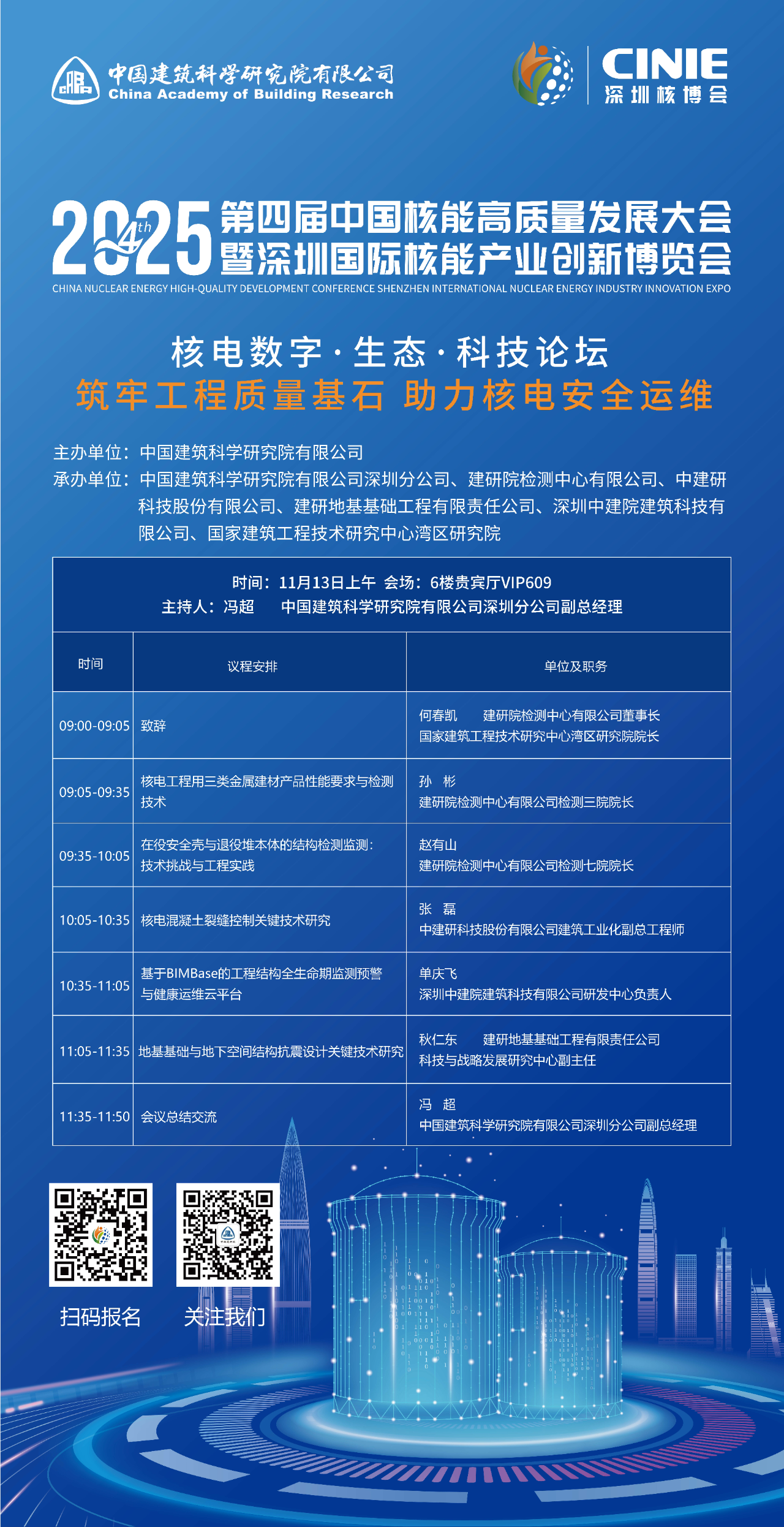 ?中國建研院作為工程建設領域的“國家隊”和科技創(chuàng)新的重要引領者,積極投身核電產業(yè)建設,深度參與國家多項重大核電工程。本屆大會期間,中國建研院將以“科技創(chuàng)新 賦能核電高質量發(fā)展”為主題組織“核電數(shù)字·生態(tài)·科技論壇”三場專題分論壇并設置展區(qū),全面展示在核電領域的技術成果與實踐經驗,為推動構建新型能源體系、保障國家能源安全注入強勁的“核”動力。中國建研院深圳分公司聯(lián)合相關單位以“筑牢工程質量基石 助力核電安全運維”為專題承辦工程質量與運維專題分論壇。