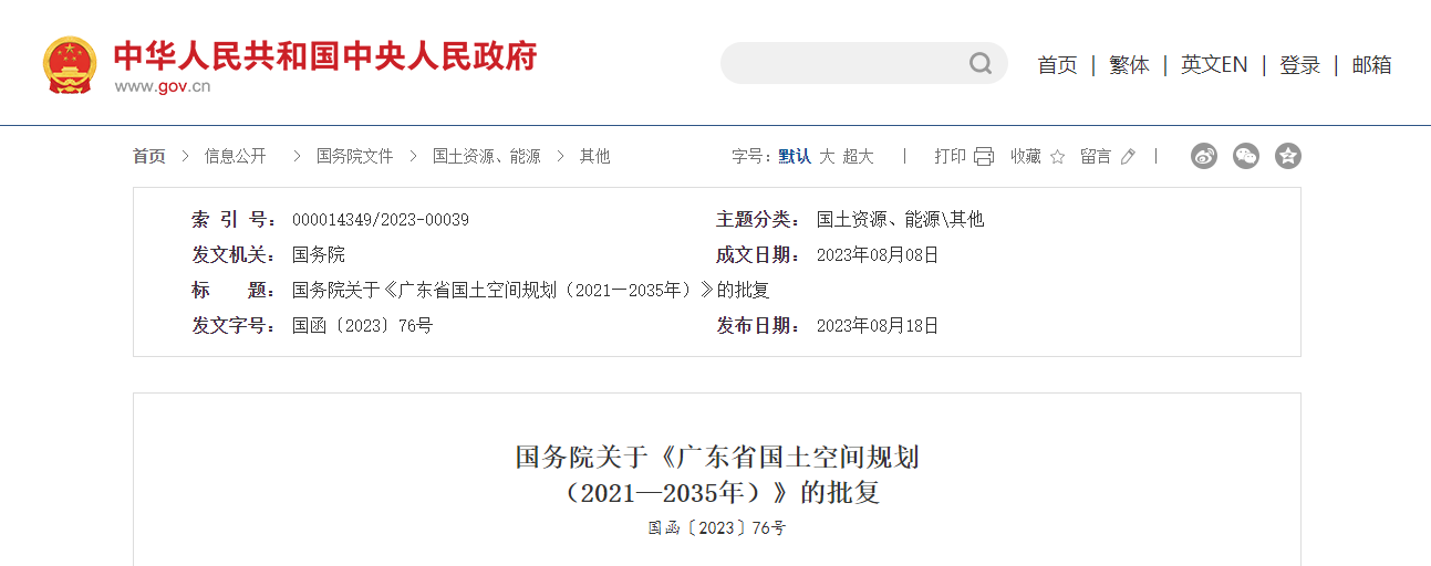 自然資源部《關于報請批準〈廣東省國土空間規劃(2021—2035年)〉的請示》(自然資發〔2023〕76號)收悉。現批復如下: